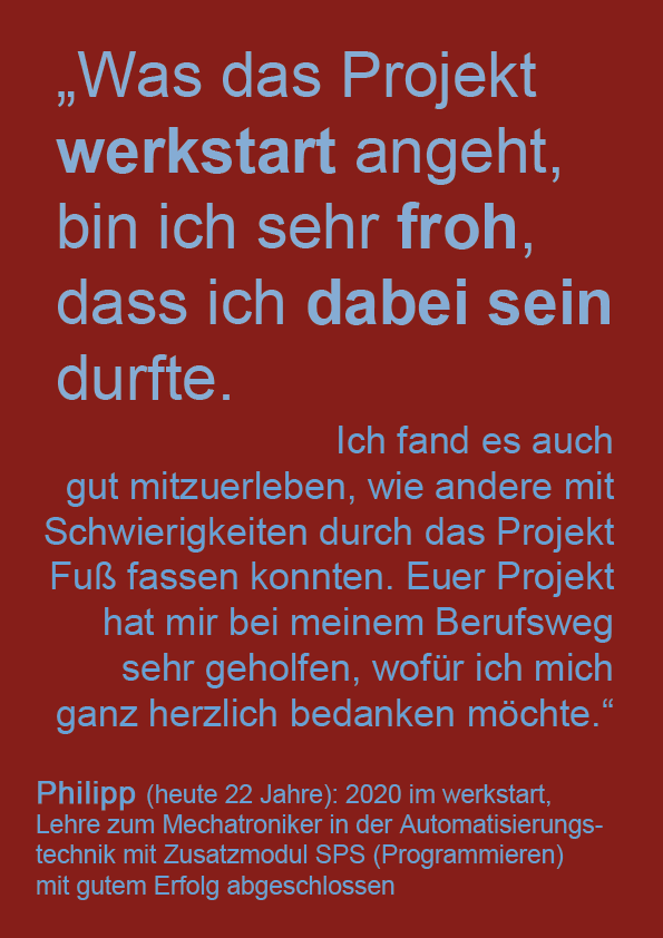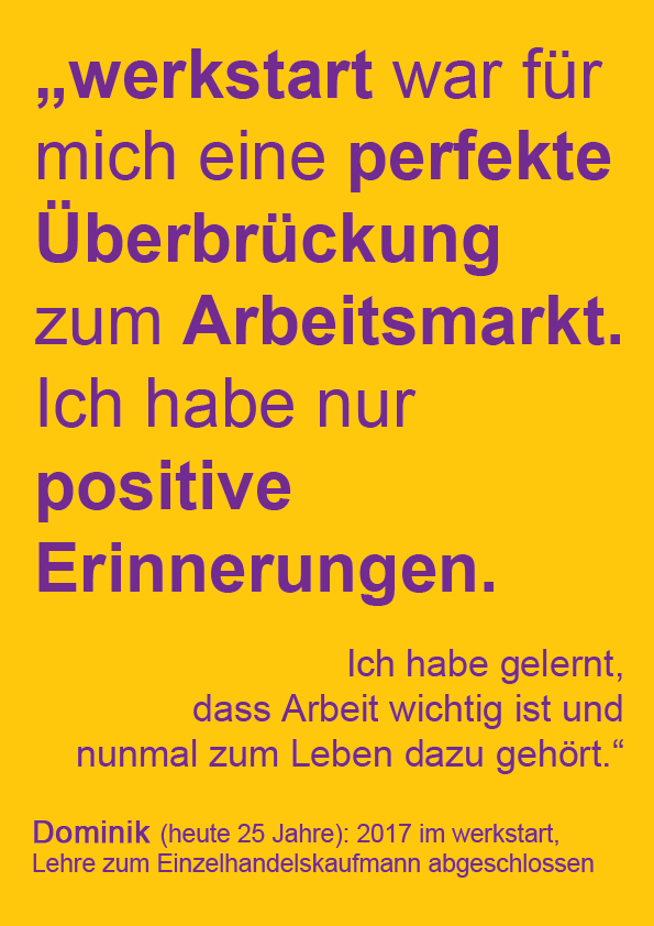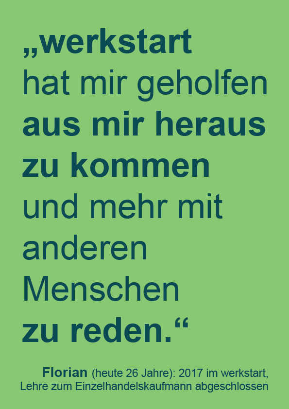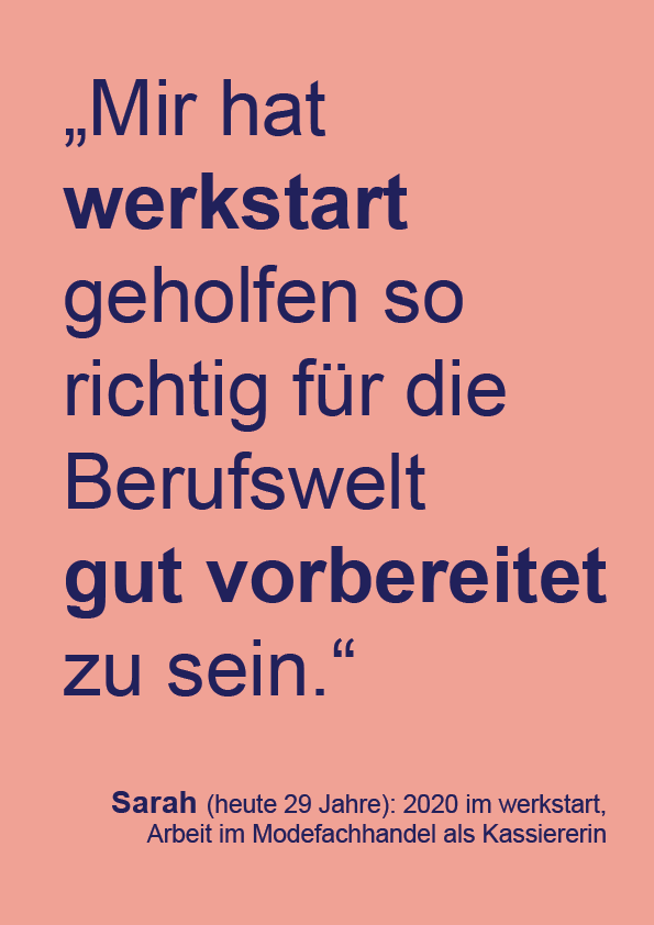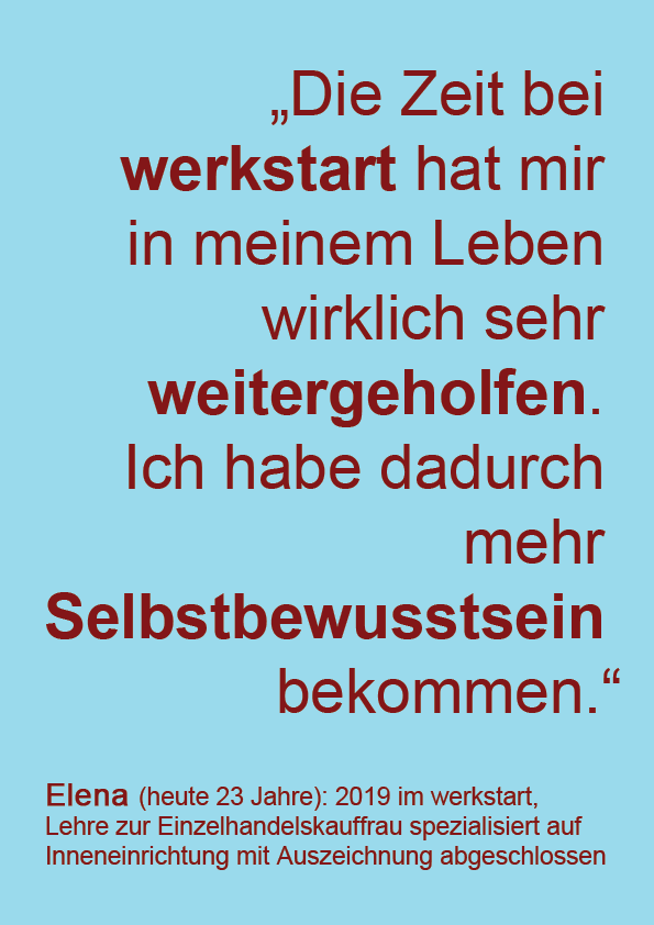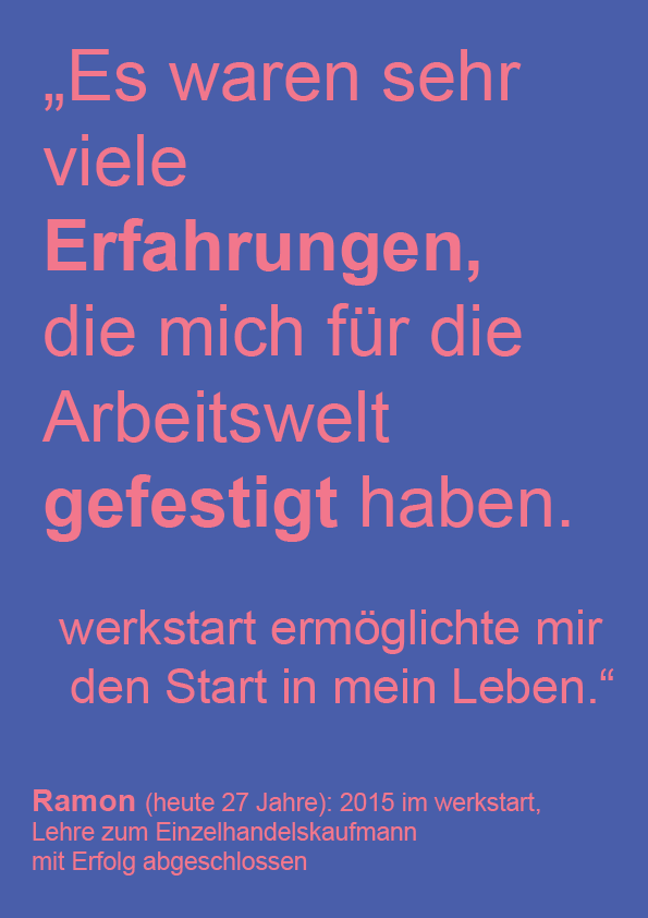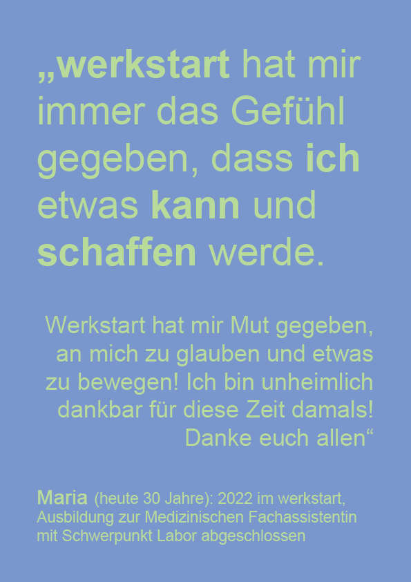 Viele Menschen wurden bisher mit großem Engagement auf ihrem Weg in die Arbeitswelt begleitet. Tolle Erfolgsgeschichten von 15 werkstart-Absolventen und Absolventinnen der letzten 10 Jahre machen die nachhaltige Wirkung sichtbar. Sie erzählen ab Anfang Mai hier von ihren Erlebnissen, Erfahrungen und Erfolgen.