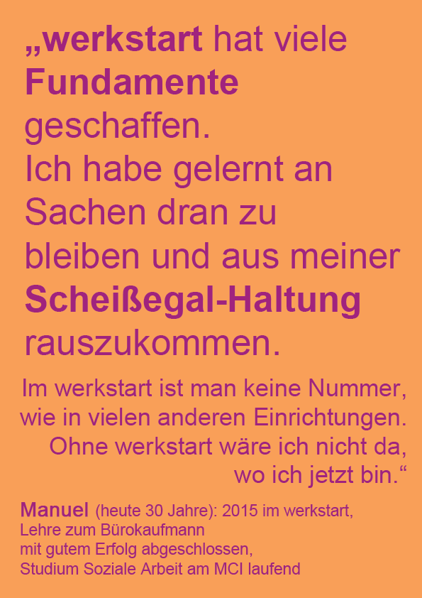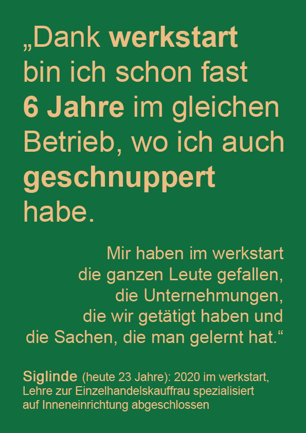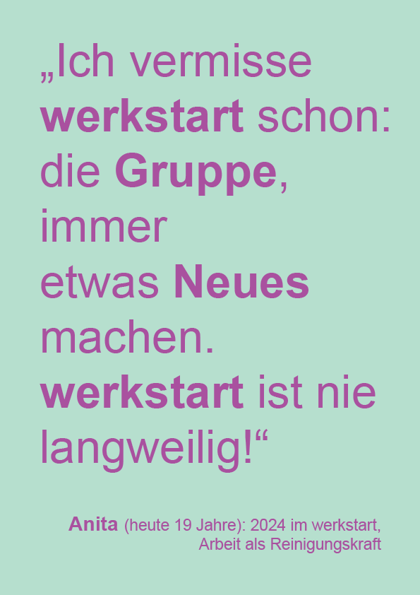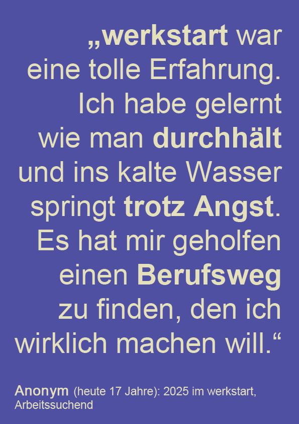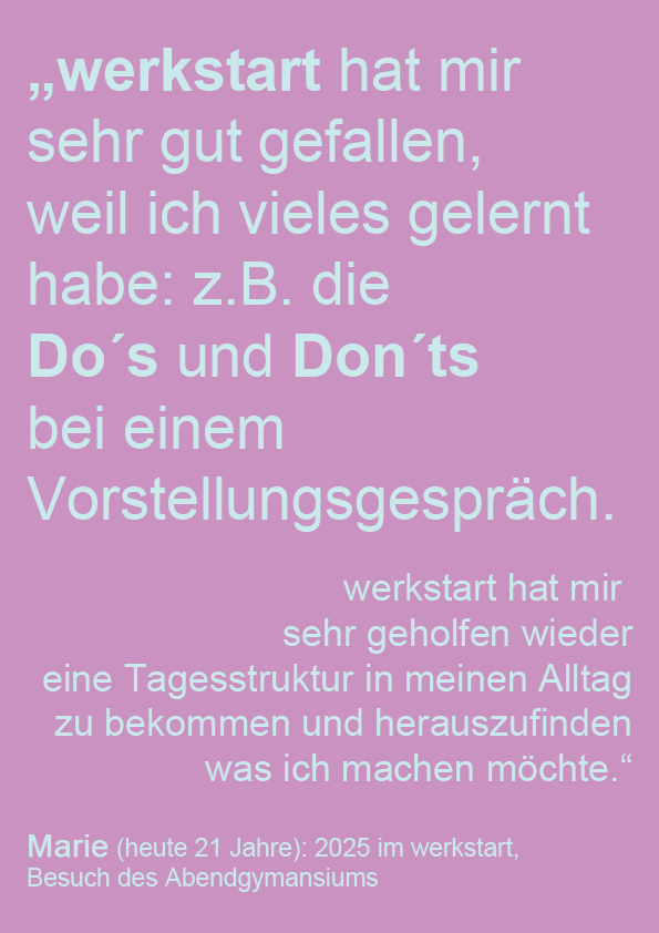 Wenn du Interesse hast, bei uns mitzumachen, freuen wir uns über deinen Anruf oder eine WhatsApp an: 0699 / 159 189 60 bei Alexandra Nicklas. Du kannst auch gerne deine Bewerbungsunterlagen schicken. Wir machen dann Termine für Gespräche und Schnuppertage aus. Und gemeinsam schauen wir, ob werkstart für dich geeignet ist.